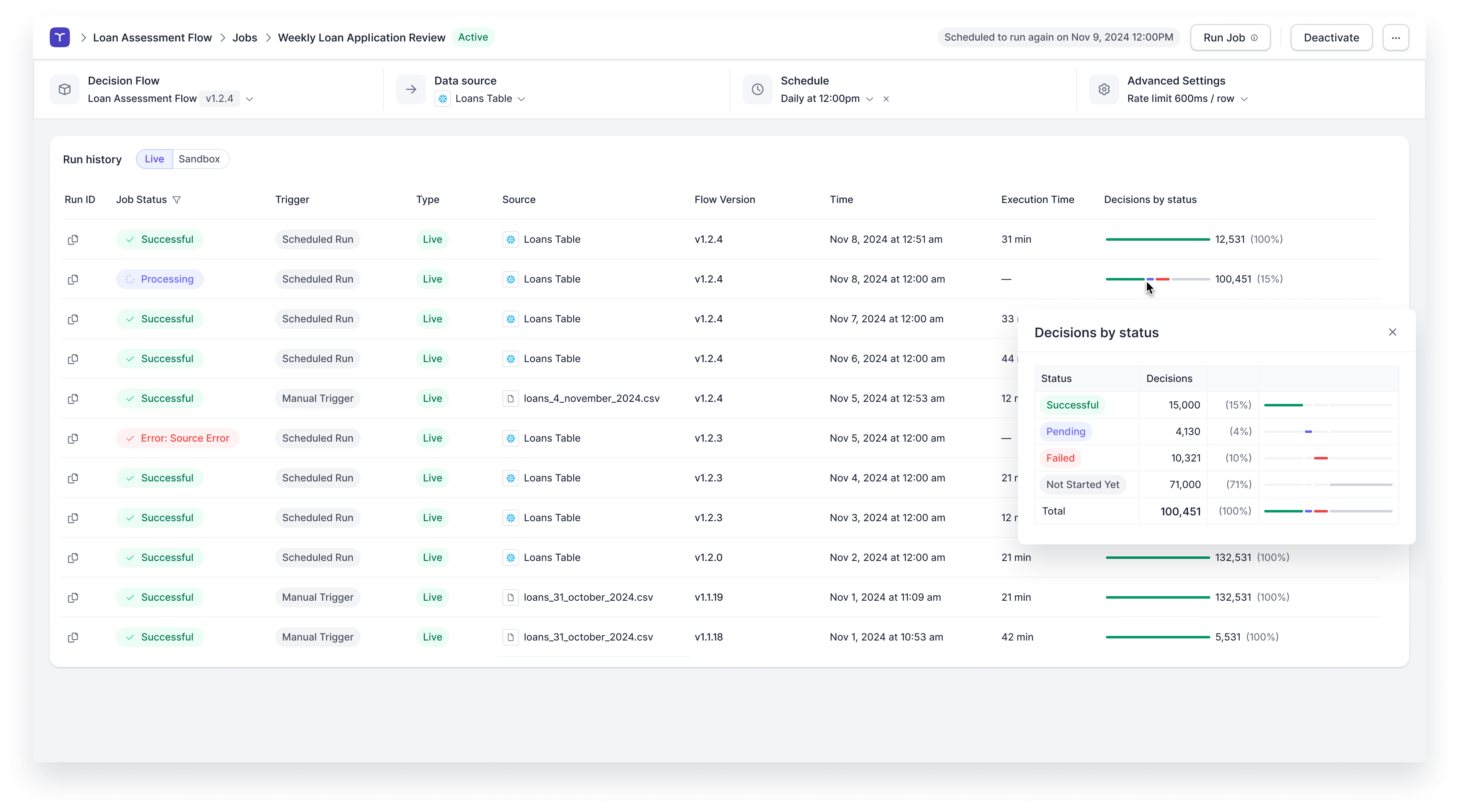 However, after customers are onboarded, it often becomes tougher for teams to use automation in the same way for activities like portfolio monitoring, where automated decisions are not triggered by a real-time API request. As a result, these “batch” decision tasks end up becoming complex processes that require a lot of technical time and resources to implement.