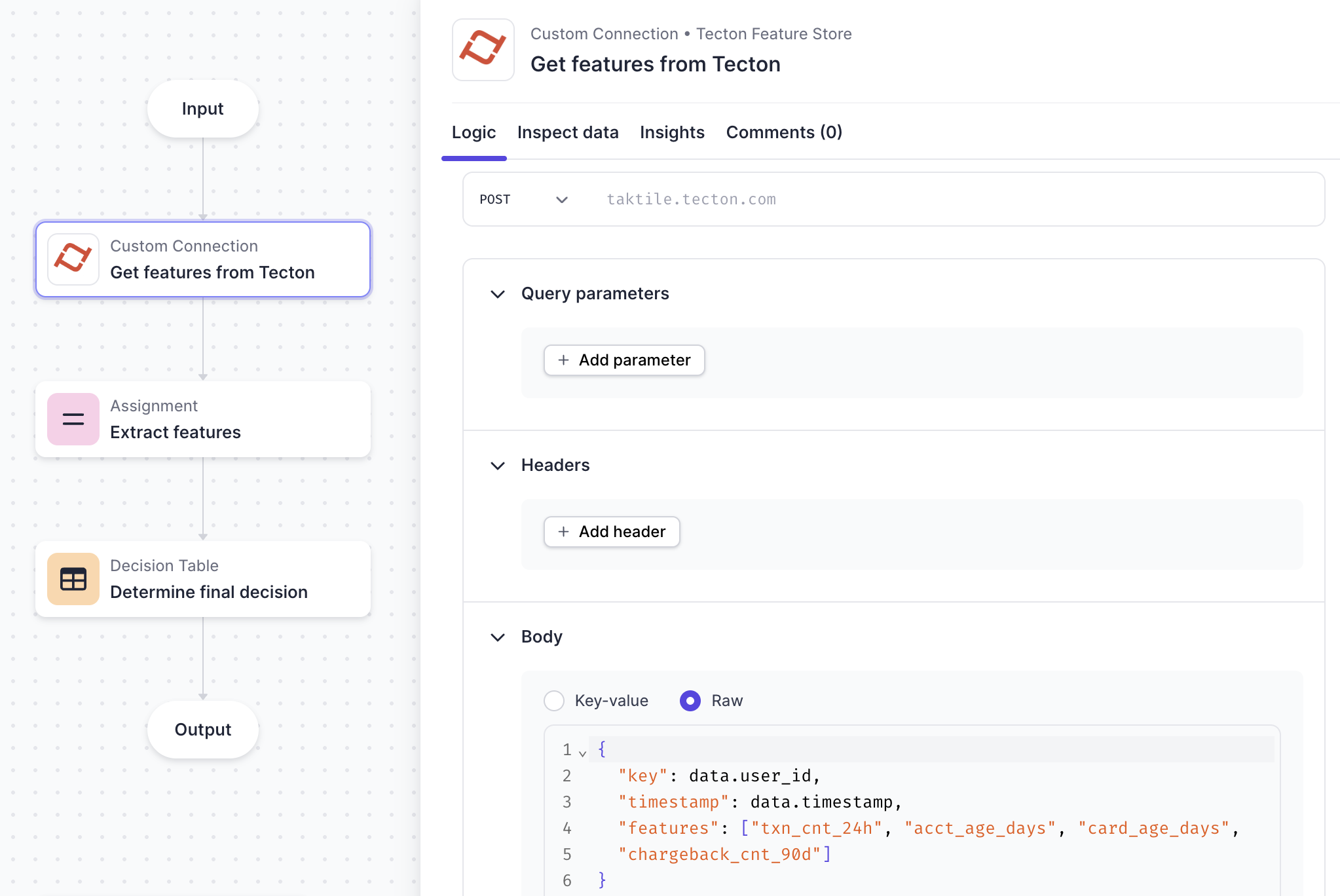 Tecton integrates as a node in the Taktile logic using Tecton’s Universal API connector. To add Tecton features, you specify the key (user_id), feature set and version of the feature.  For more information about the integration and how to use Taktile and Tecton together, reach out to our team!