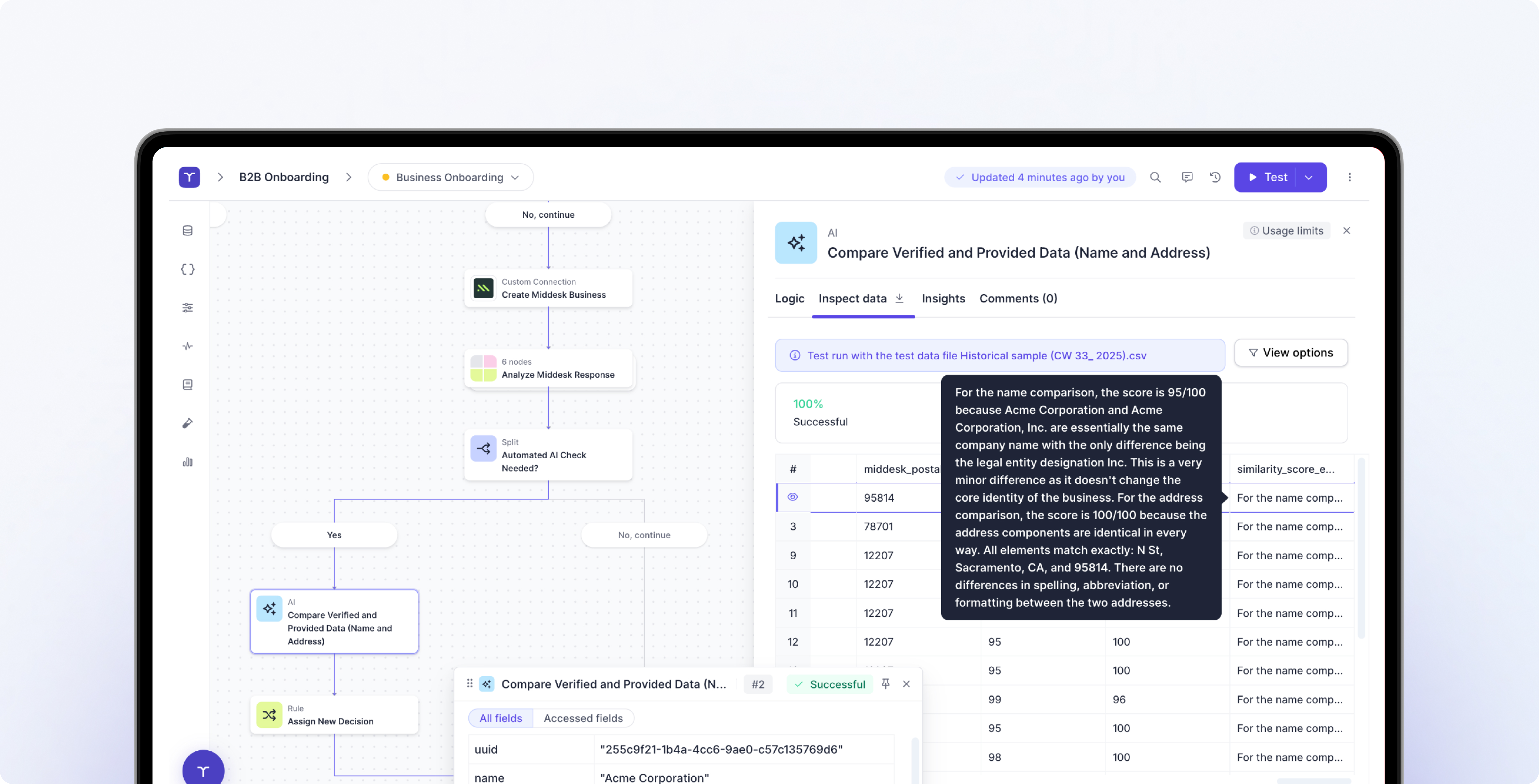 Design and operationalize your entire onboarding workflow in one workspace, combining KYC/B data, agentic AI, human-in-the-loop reviews, and granular governance controls to run compliant automation at scale.