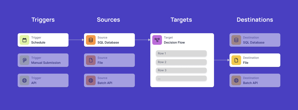However, after customers are onboarded, it often becomes tougher for teams to use automation in the same way for activities like portfolio monitoring, where automated decisions are not triggered by a real-time API request. As a result, these “batch” decision tasks end up becoming complex processes that require a lot of technical time and resources to implement.