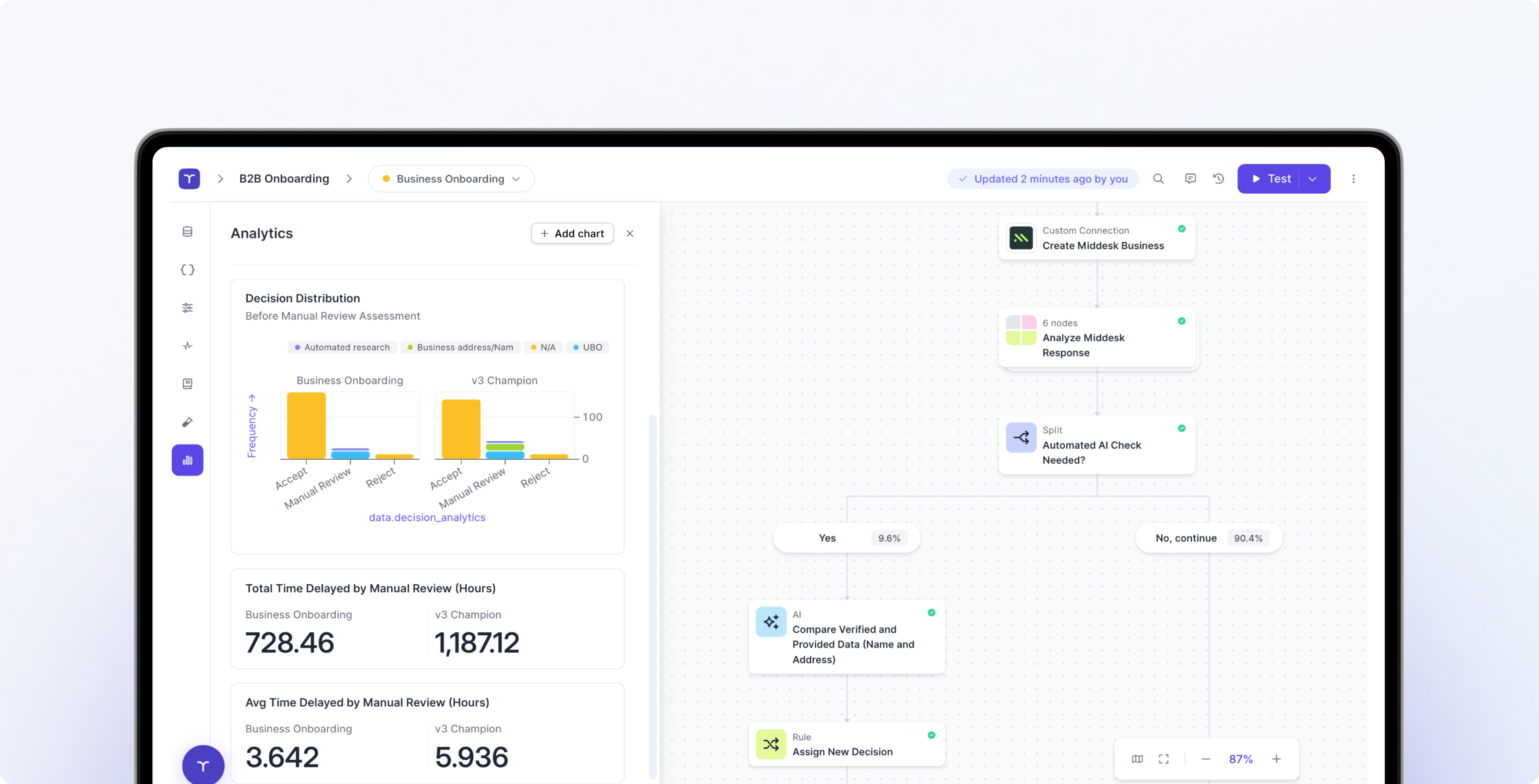 Design and operationalize your entire onboarding workflow in one workspace, combining KYC/B data, agentic AI, human-in-the-loop reviews, and granular governance controls to run compliant automation at scale.